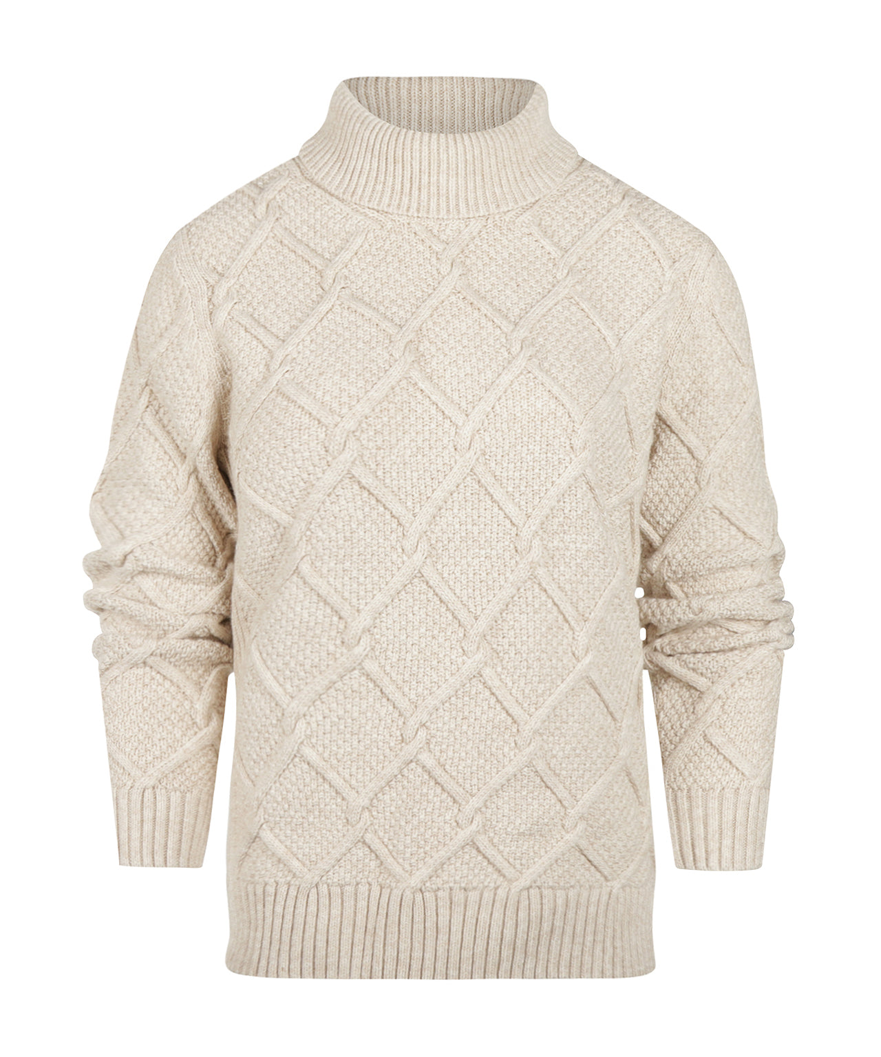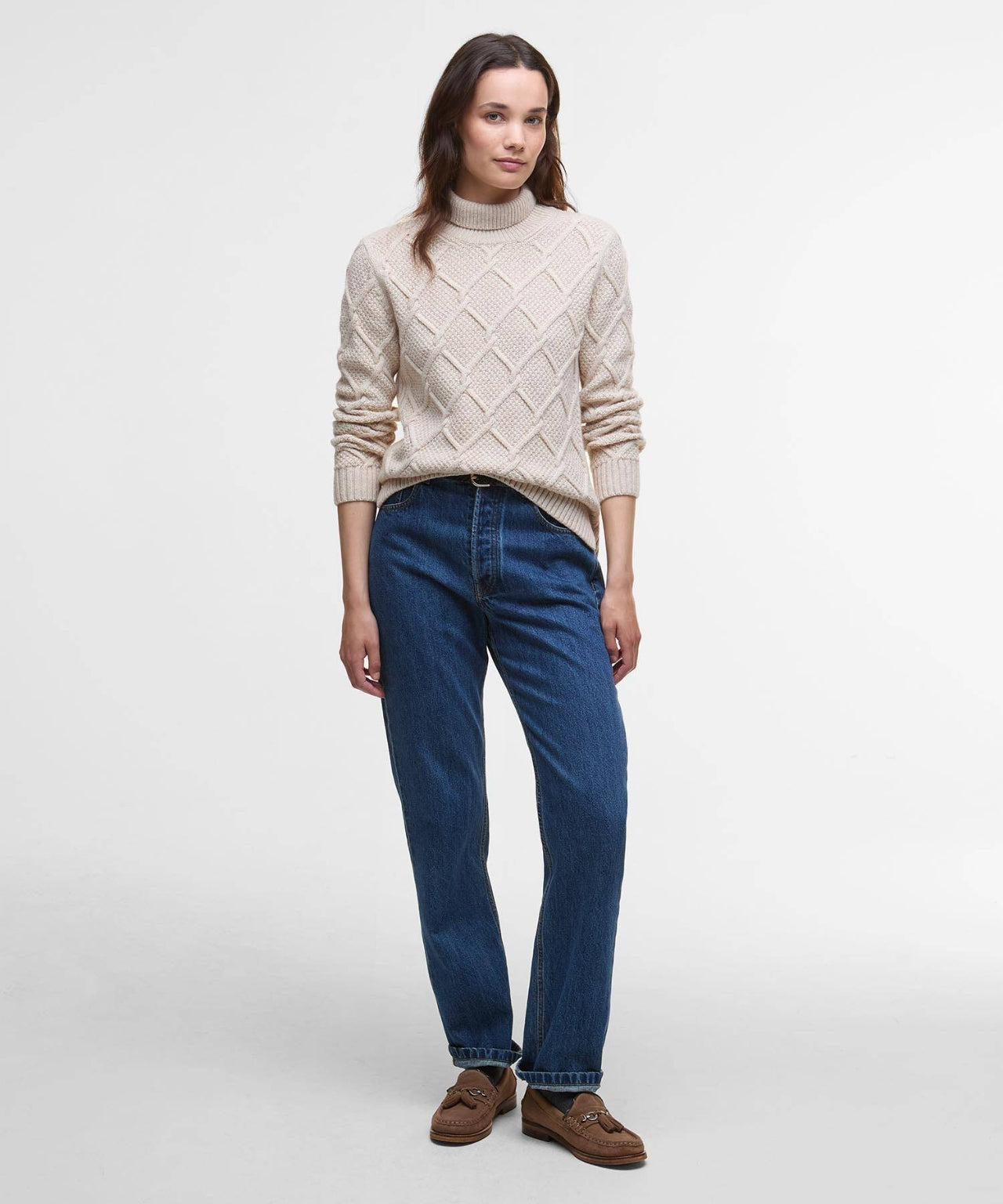 Dames coltrui van 55% wol en 45% katoen met opstaande kraag en lange mouwen, ideaal voor casual looks. Het argyle-geïnspireerde kabelpatroon geeft de trui een stijlvolle uitstraling. Voorzien van Barbour ID-label aan de achterzijde van de nek. Lengte achterkant: 64 cm. Handwas op 30°C.