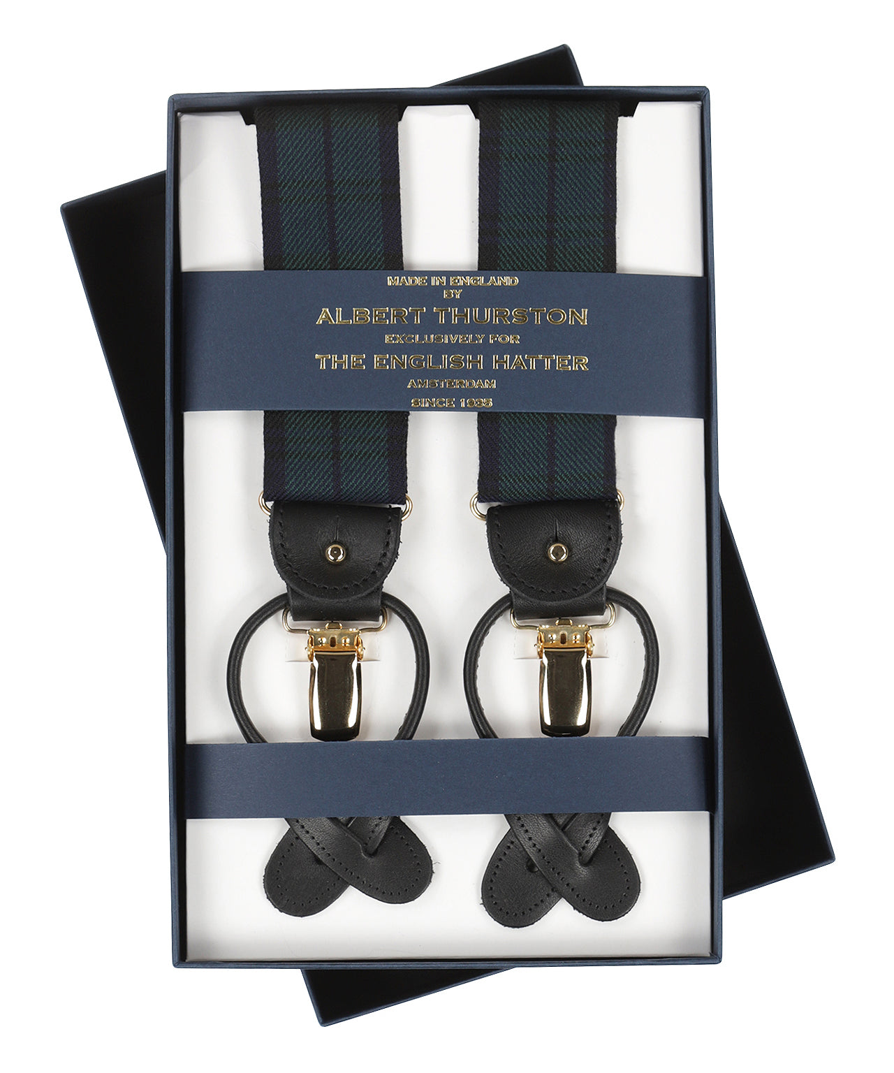 Herenbretels met clips en patten van Albert Thurston Ltd, afkomstig uit het Verenigd Koninkrijk. Albert Thurston Ltd is een Brits merk sinds 1820, bekend om hoogwaardige en duurzame bretels en riemen in klassieke ontwerpen.