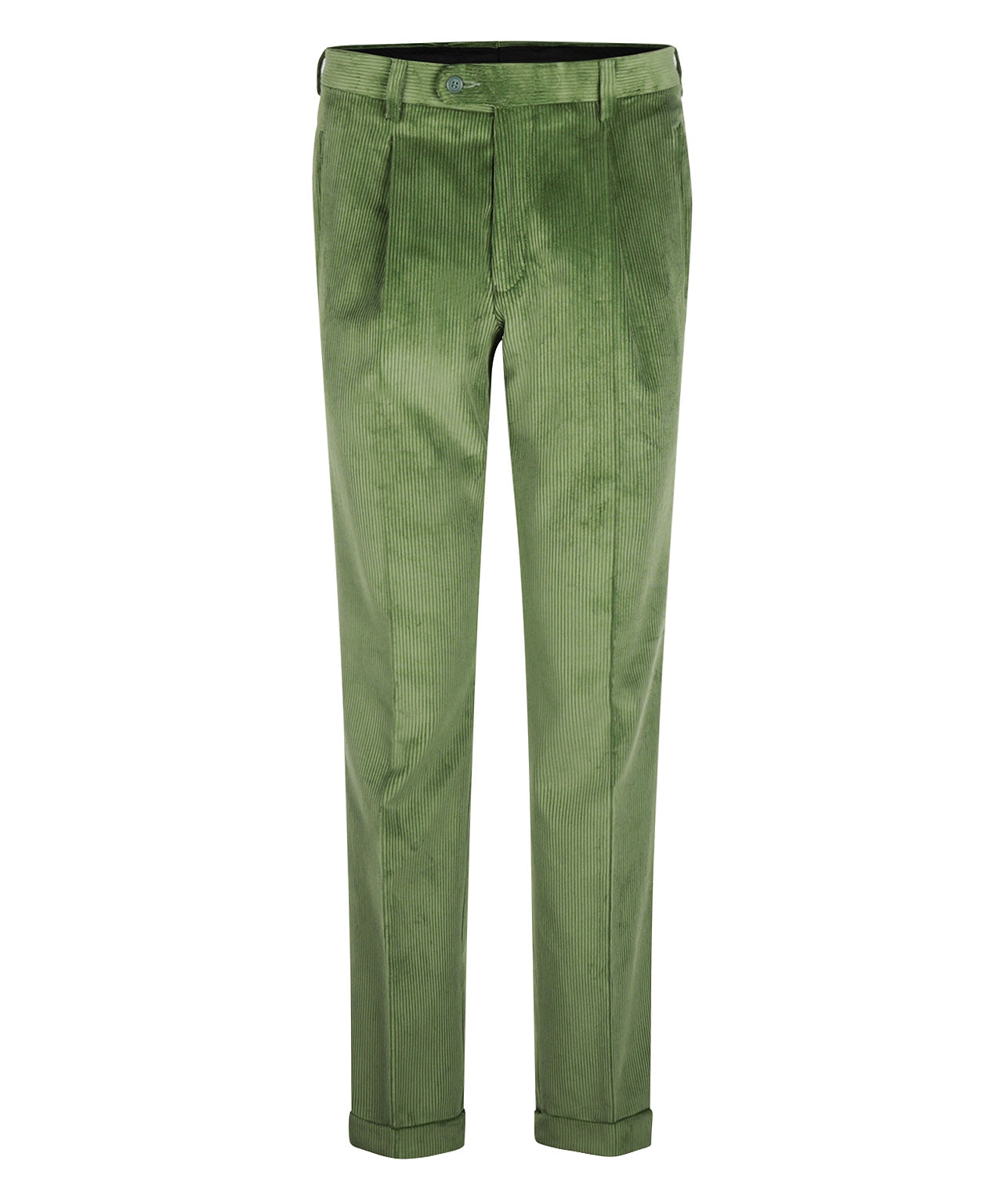 Volle ribbroek gemaakt van de corduroy van Brisbane and Moss. De broek is voorzien van een bandplooi plus een omslag bij de pijp. De pijpopening is klassiek breed van maar liefst 22cm plat gemeten.