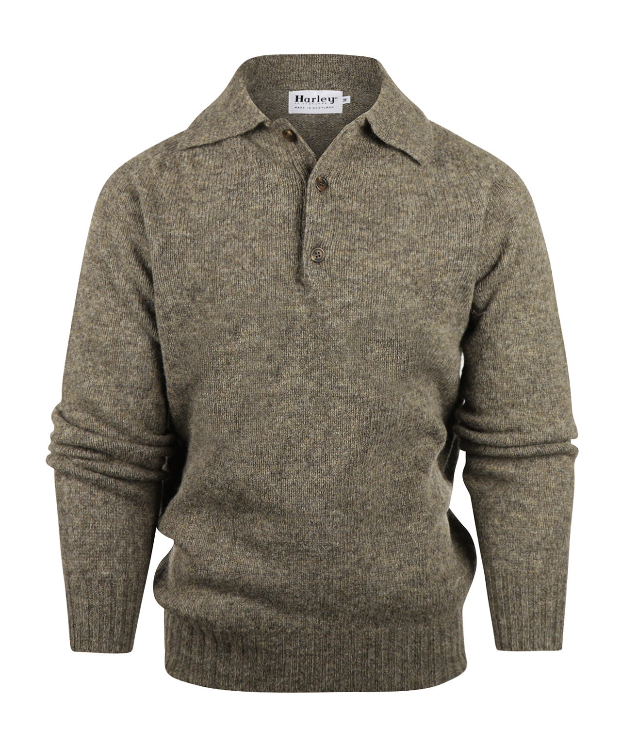 Klassieke pullover van Harley of Scotland met stijlvolle polokraag en drie knopen. Combineert tijdloos Schots vakmanschap met een sportief accent.
