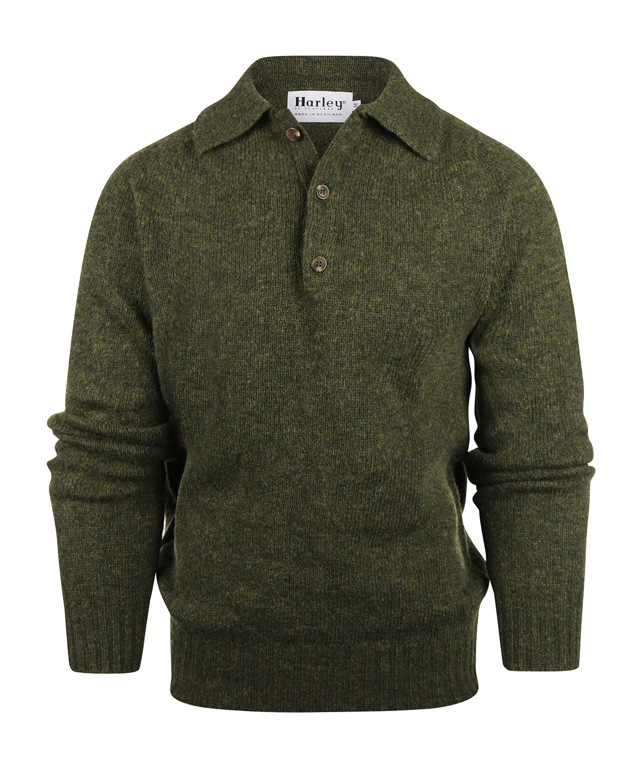 Klassieke pullover van Harley of Scotland met stijlvolle polokraag en drie knopen. Combineert tijdloos Schots vakmanschap met een sportief accent.