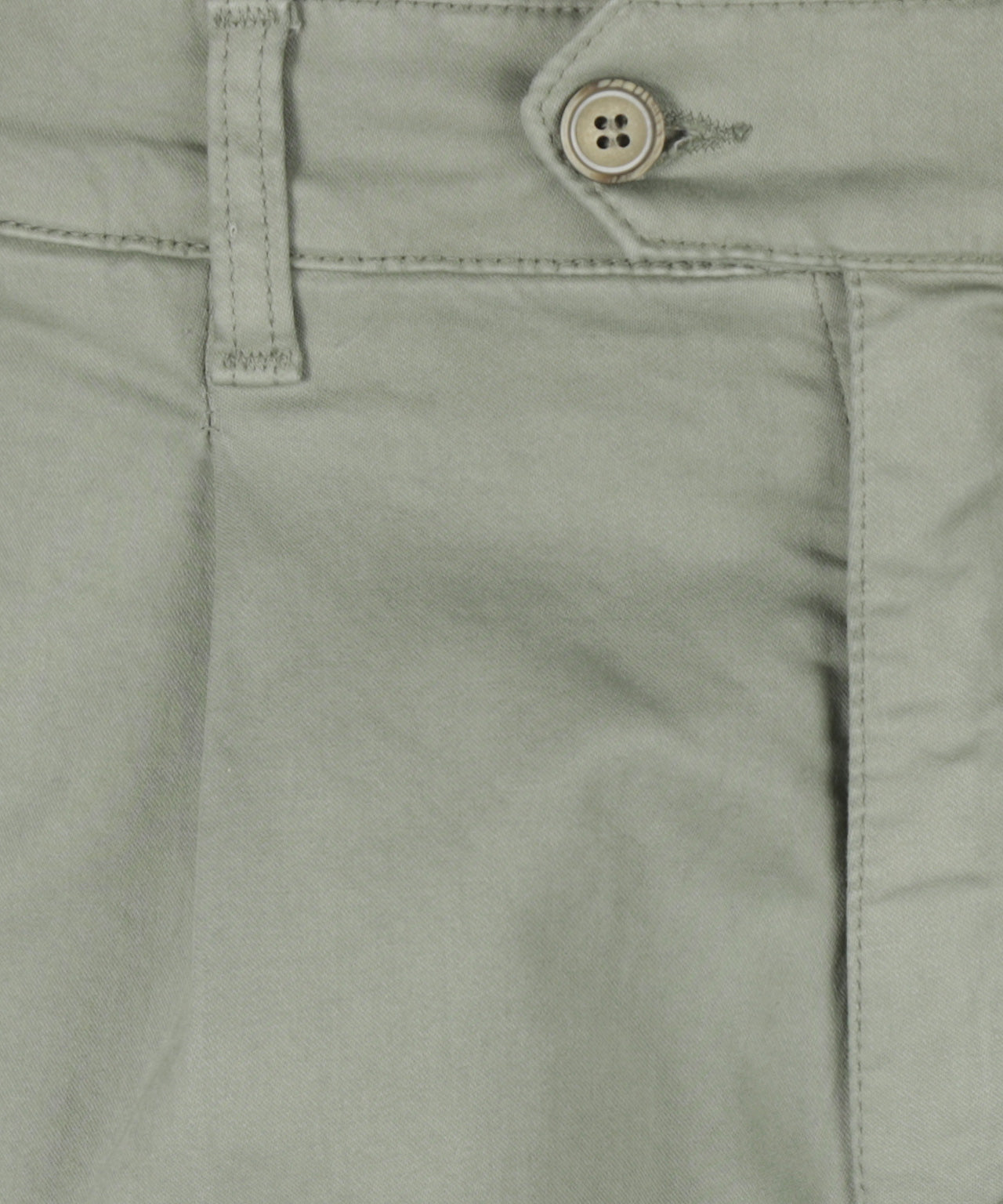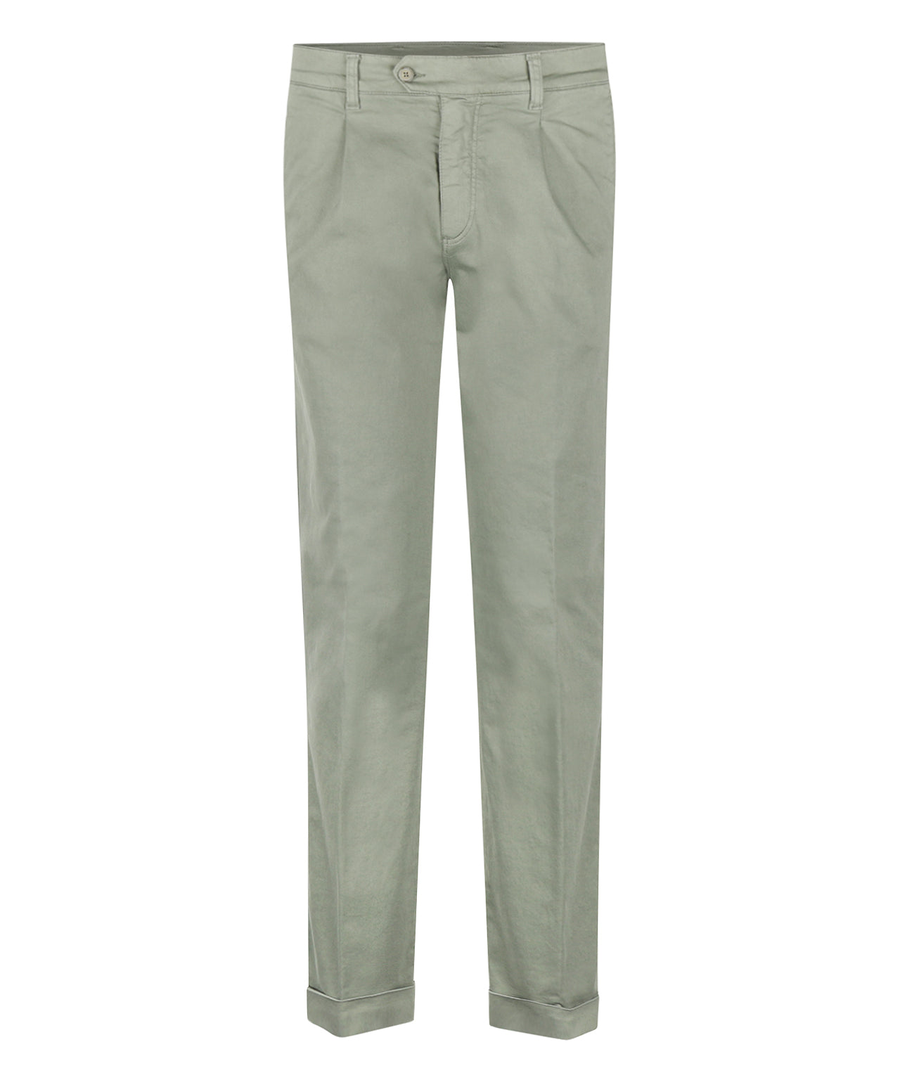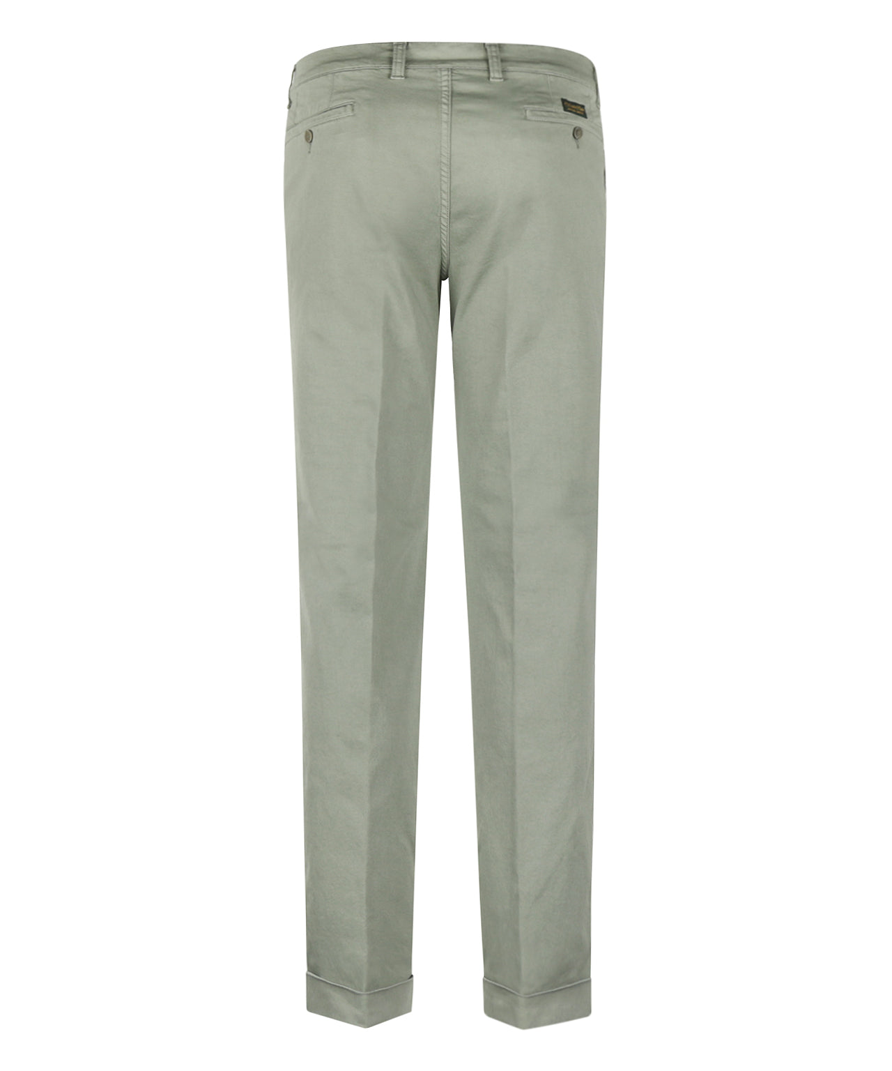 Katoenen pantalon met bandplooi en een omslag. In het katoen zit 3% elastan mee geweven zodat deze pantalon comfortabel draagt. Deze broeken worden speciaal voor The English Hatter gemaakt in Europa. De breedte van de pijp bij de omslag is 19 cm (plat gemeten).