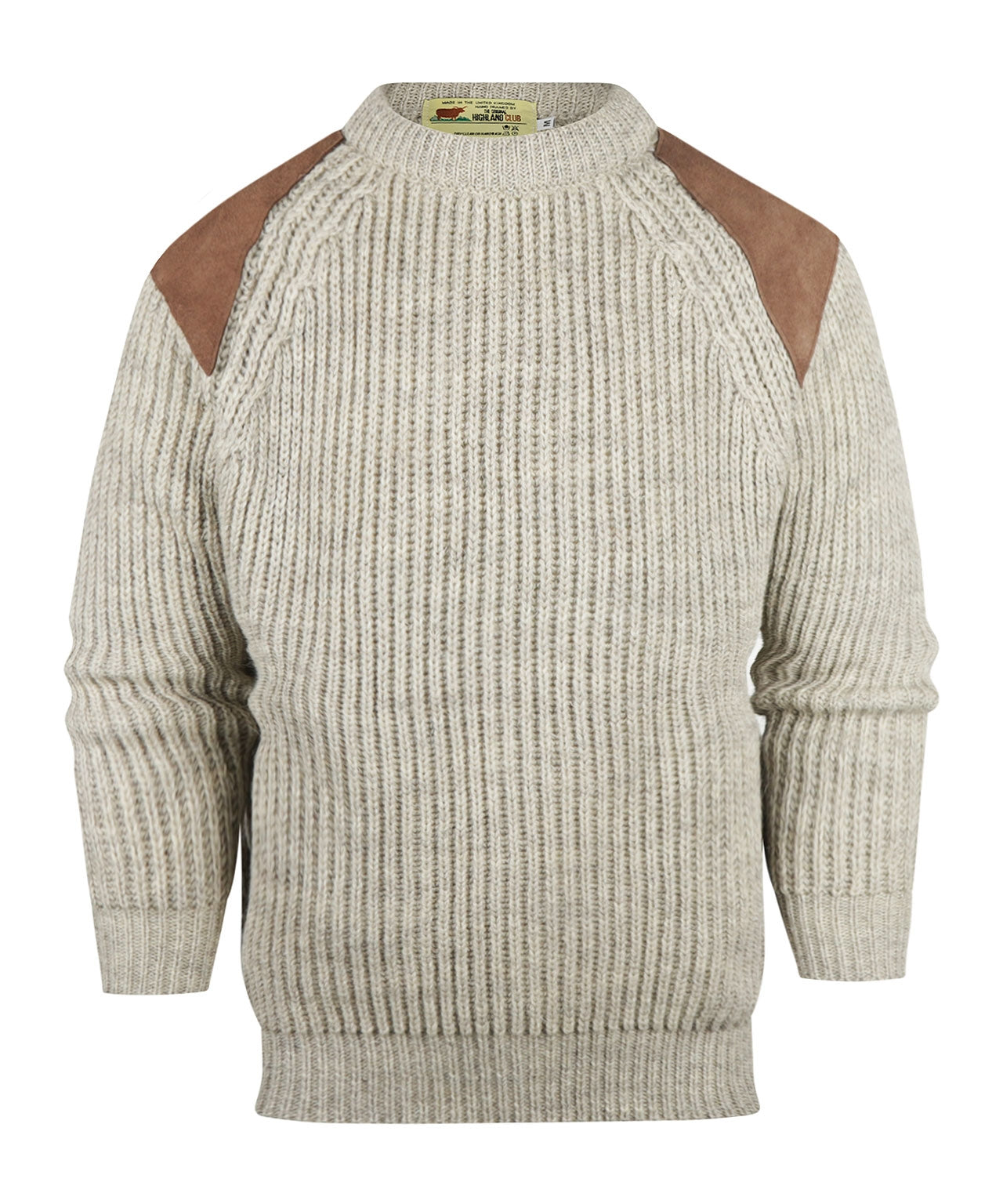 Geweldige 100% wollen pullover met suede stukken op de mouw en schouder. Deze Highland Club pullover is gemaakt met ongeverfde wol, deze wol komt rechtstreeks van het schaap en is dus de natuurlijke kleur. De pullover is tradioneel gemaakt op een "hand frame". Omdat dit een kleine fabrikant is kan de kleur van de leren stukken een beetje variëren. De ene zending zijn ze wat donkerder bruin en soms wat lichter bruin.