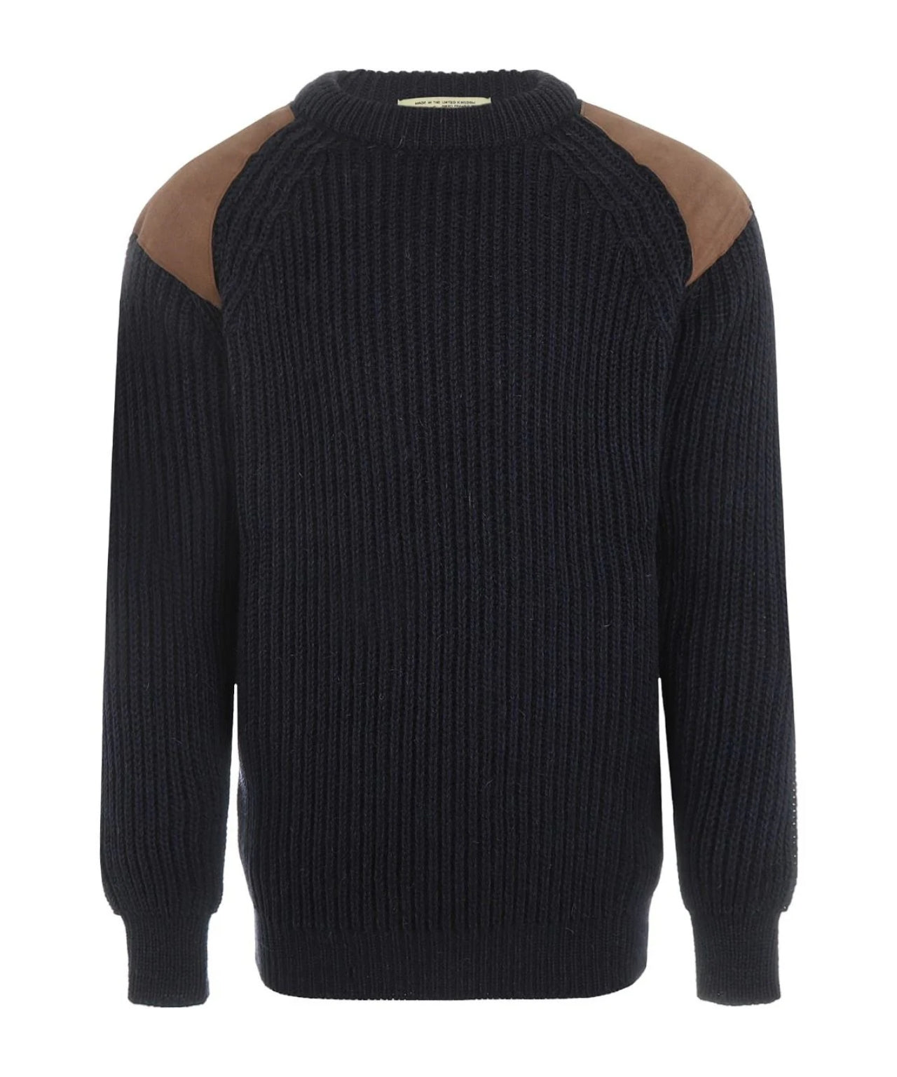 Geweldige 100% wollen pullover met suede stukken op de mouw en schouder. Deze Highland Club pullover is gemaakt met ongeverfde wol, deze wol komt rechtstreeks van het schaap en is dus de natuurlijke kleur. De pullover is tradioneel gemaakt op een "hand frame". Omdat dit een kleine fabrikant is kan de kleur van de leren stukken een beetje variëren. De ene zending zijn ze wat donkerder bruin en soms wat lichter bruin.