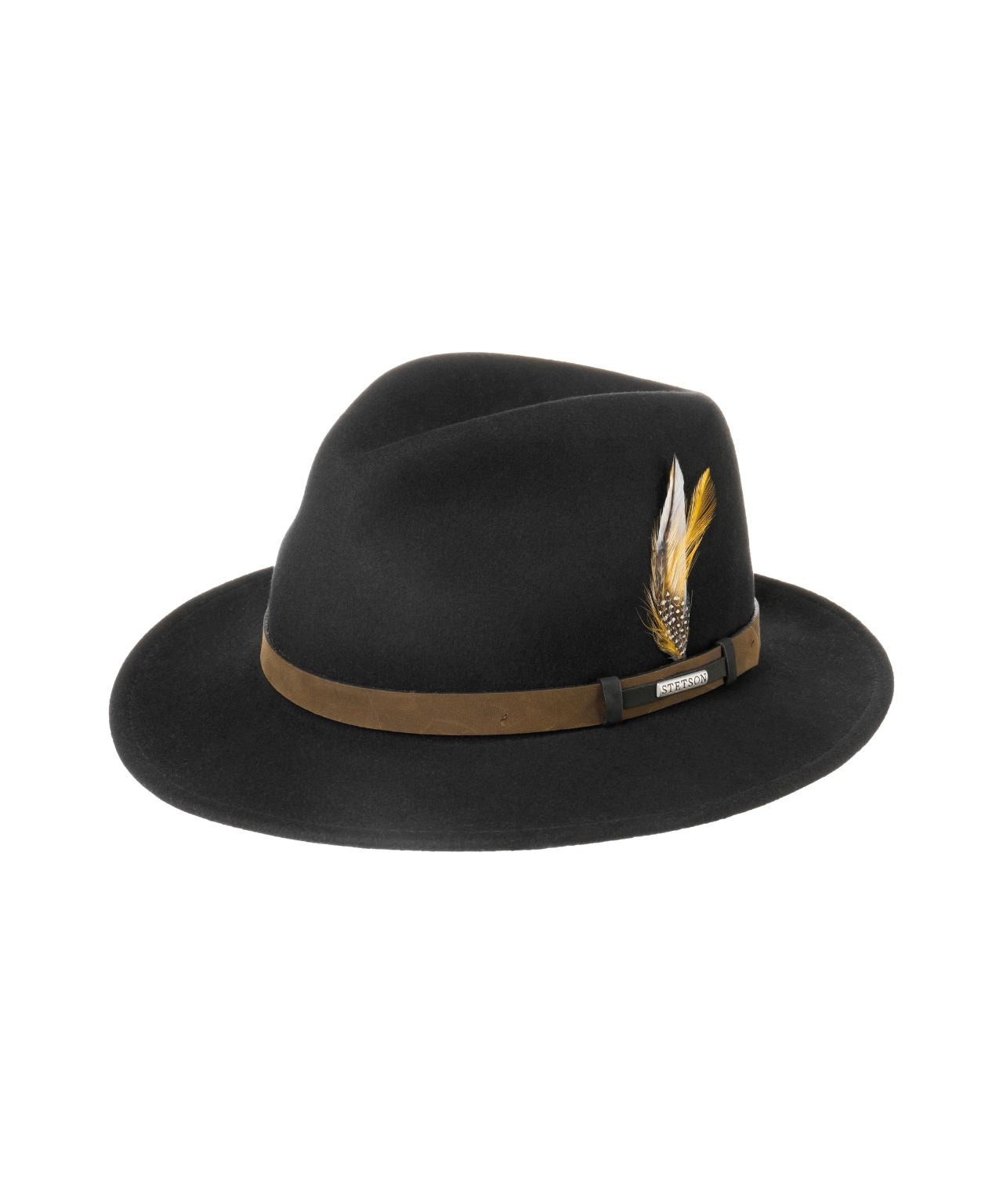 Soepele wol vilten hoed van Stetson. De hoed heeft een leren band en een veertje.